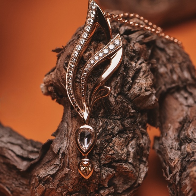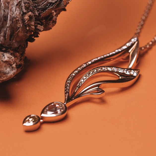 Elégant pendentif en or rose orné d'un diamant taille rose et d'un diamant brun fancy. La forme filigrane est ornée de brillants blancs et cognac et confère au bijou une légèreté florale et vivante.