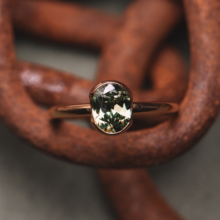 La monture ouverte laisse passer la lumière de toutes les directions et souligne l'éclat exceptionnel de cette pierre précieuse rare. Une pièce unique fabriquée à la main dans notre atelier - élégante, naturelle et pleine de vie.