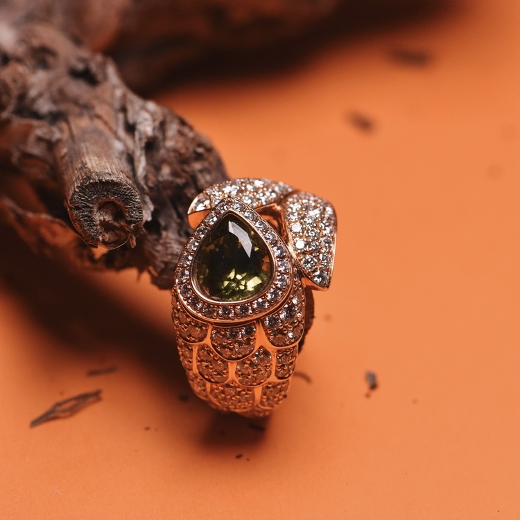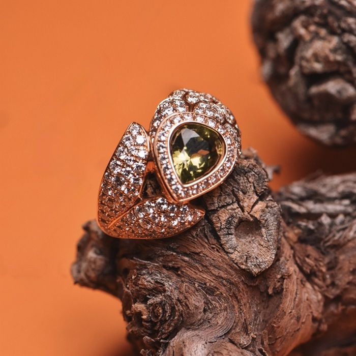 Bague lumineuse en or rose, sertie d'un péridot en forme de goutte de 2.14ct. La pierre précieuse vert vif est encadrée de 141 brillants qui font briller le design luxueux de tout son éclat. Un bijou au fort rayonnement, alliant magistralement élégance et extravagance, qui peut faire penser à un fish.