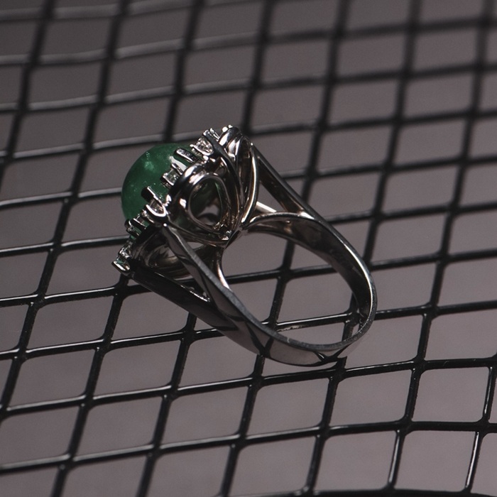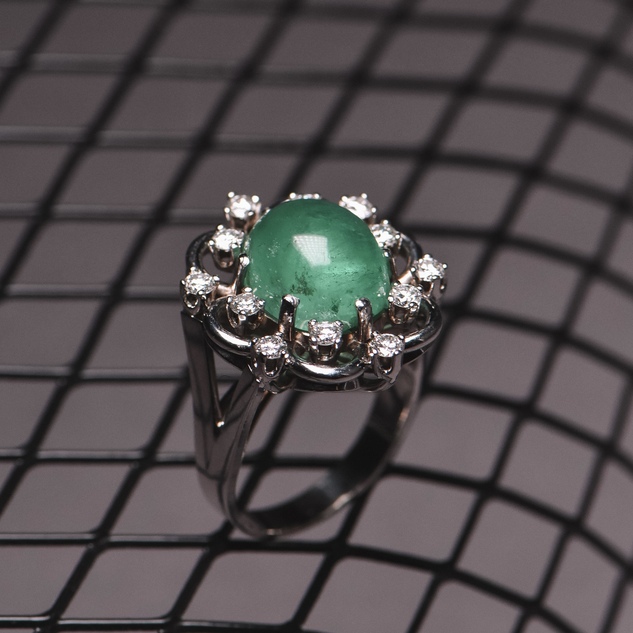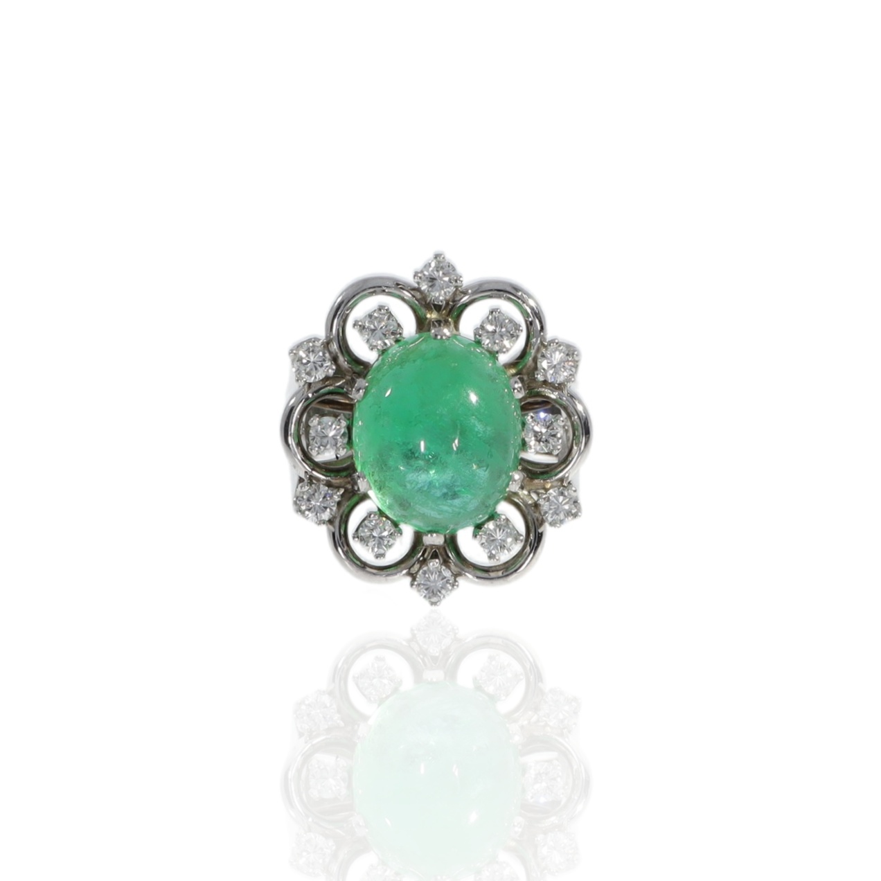 Elégante bague en or blanc 750 sertie d'une émeraude taillée en cabochon. Douze brillants étincelants entourent la pierre principale et apportent une touche d'éclat.