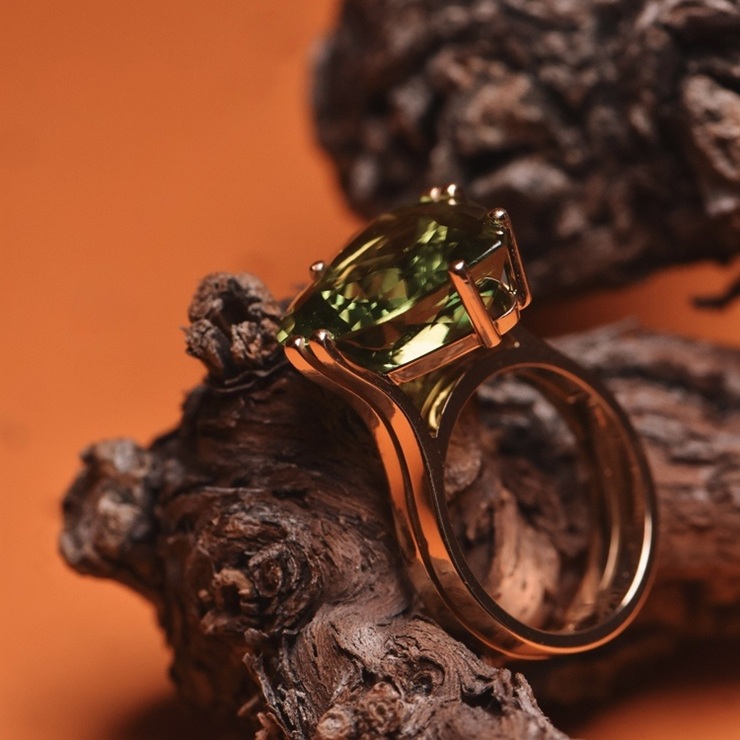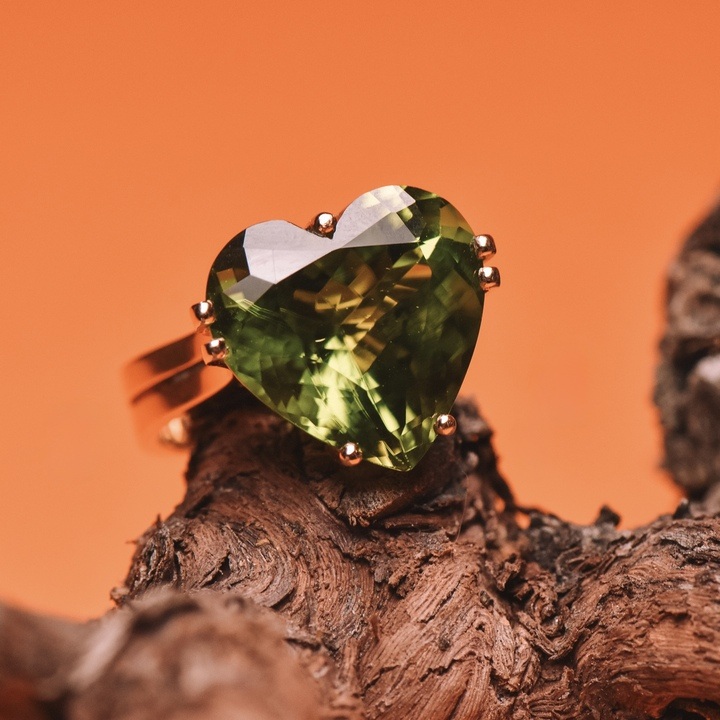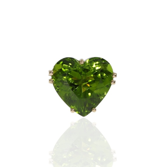 Bague expressive en or jaune avec un péridot facetté taille cœur d'environ 18.82ct. La couleur verte intense de la pierre précieuse fait de cette pièce un véritable accroche-regard, tandis que le sertissage clair et moderne met parfaitement en valeur la pierre.